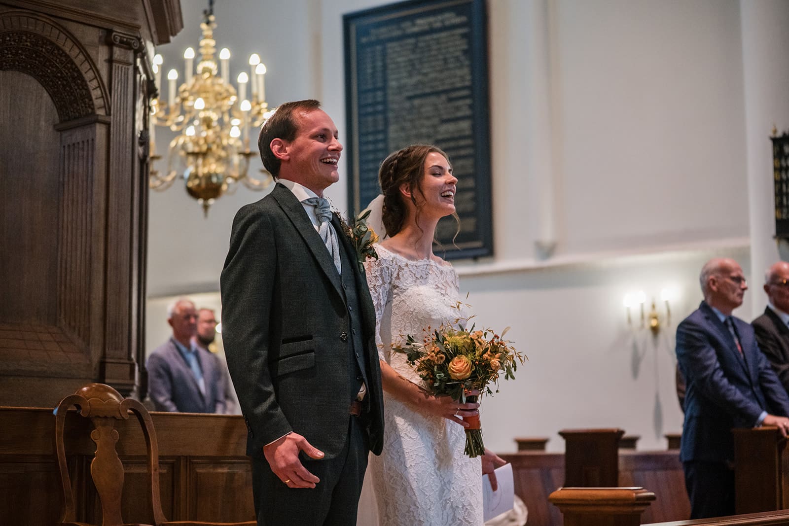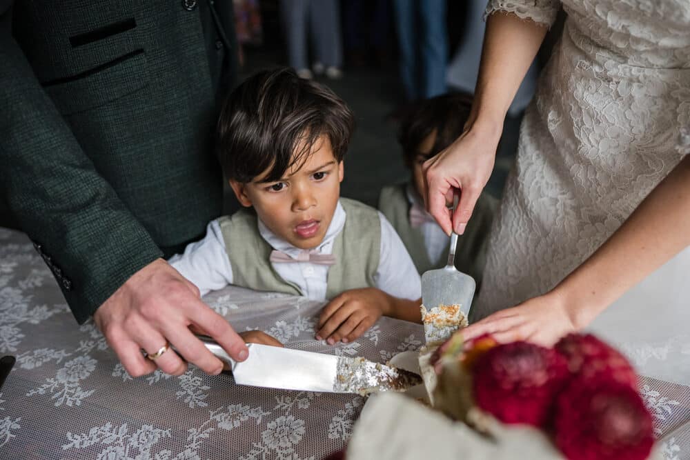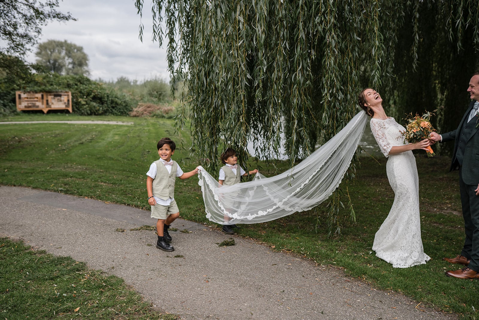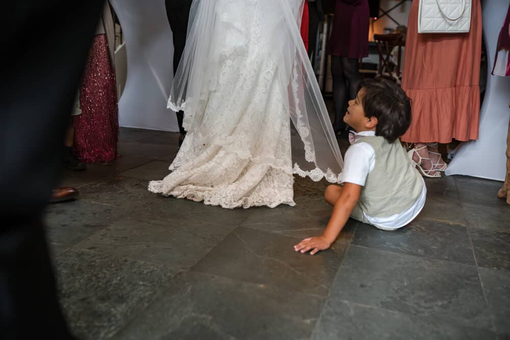 De laatste 10 minuten kwamen de neefjes ook nog even langs om met het bruidspaar op de foto te gaan. Die vonden alleen de sluier erg leuk… om aan te trekken. Gelukkig zat die goed vast. (Nek van bruidegom is nog oke!)