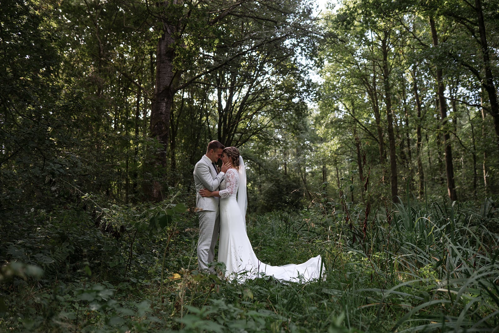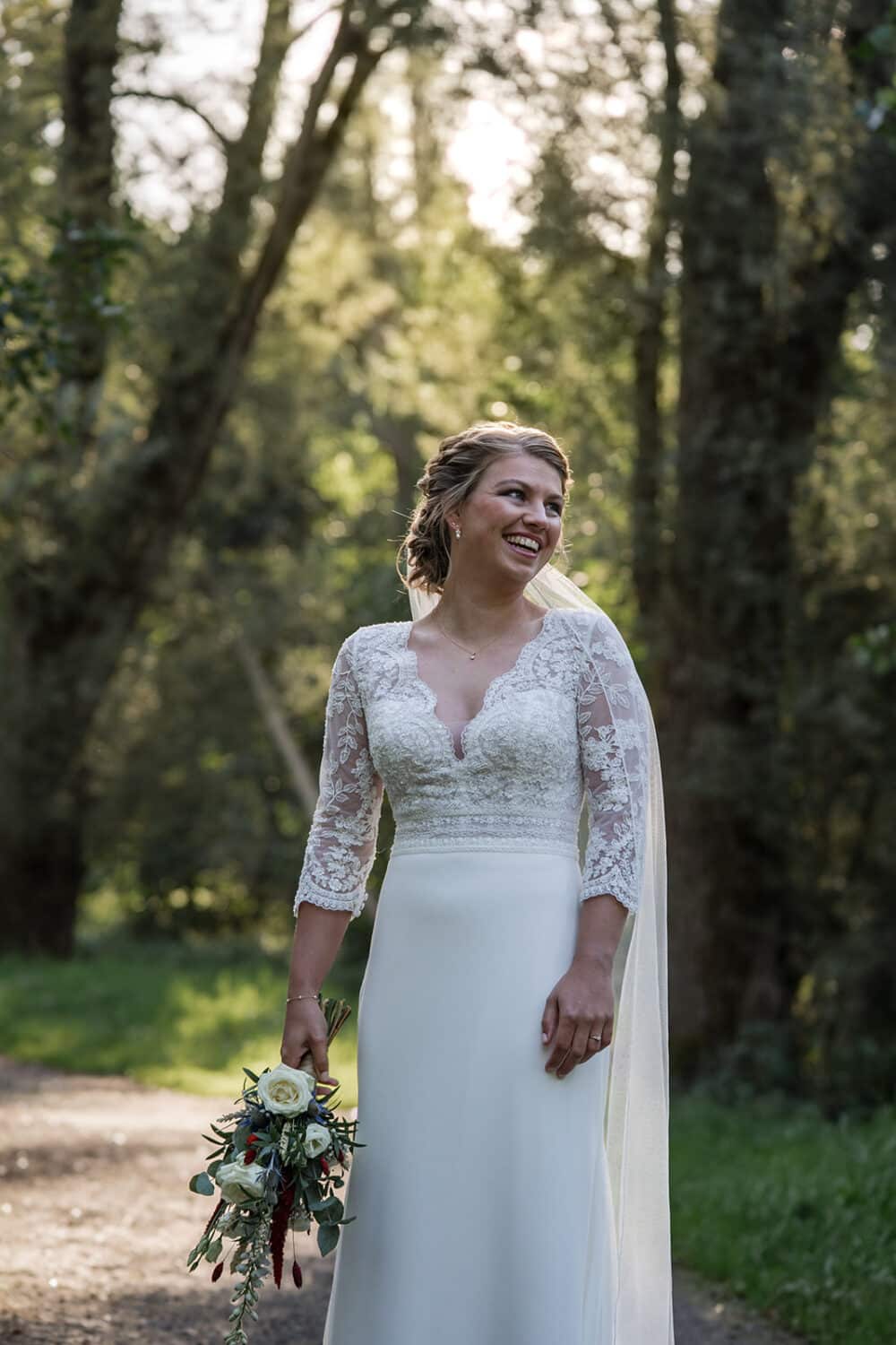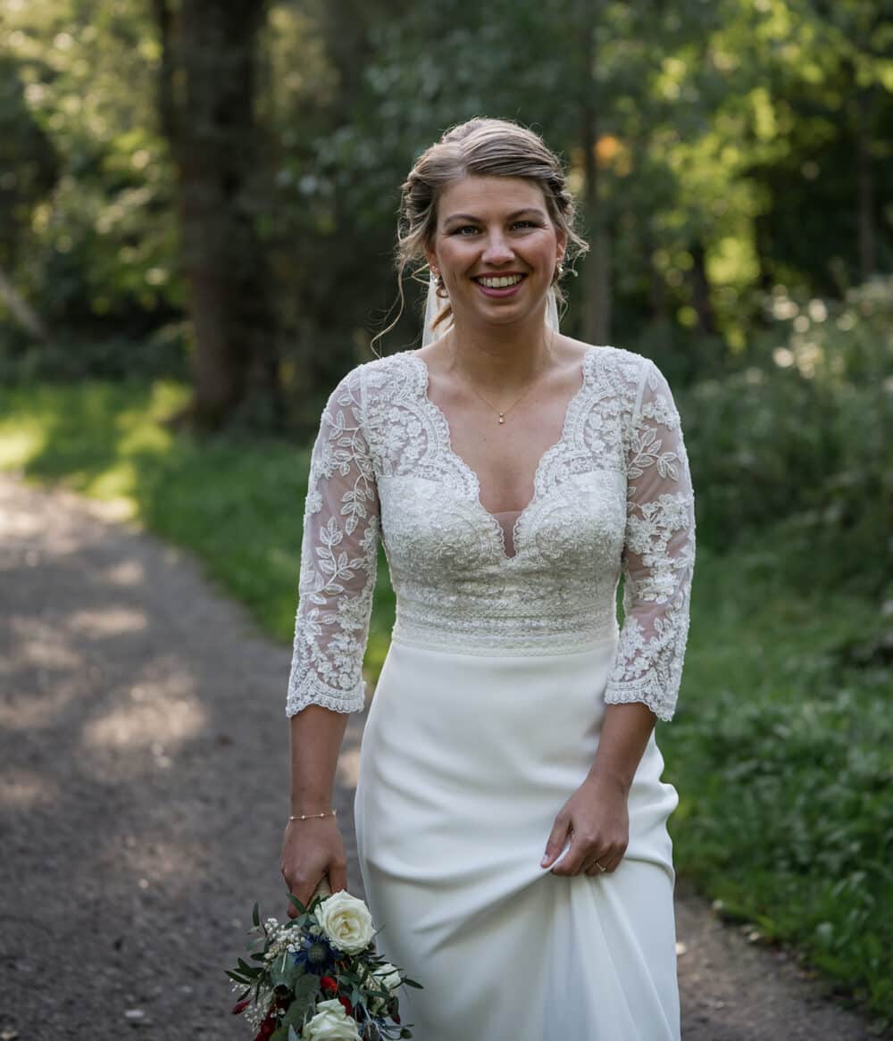 Ze wilde ook een echte bos foto, het liefst waarbij je geen pad meer zag. Dat hoef je tegen mij maar 1x te zeggen. En 5 tellen later stuur ik je de brandnetels in! Hebben natuurlijk even goed opgelet zodat de jurk heel bleef, en er even een doek ondergestopt.