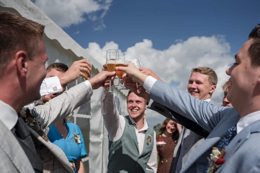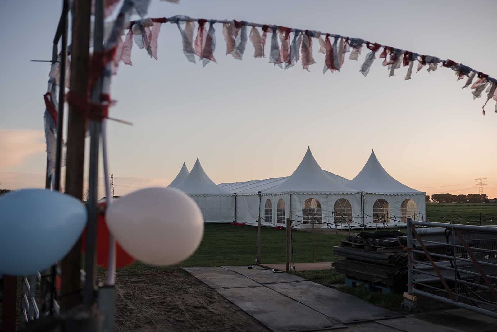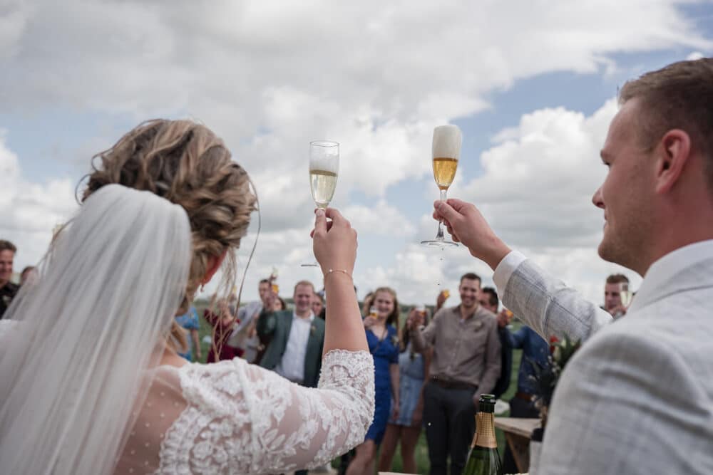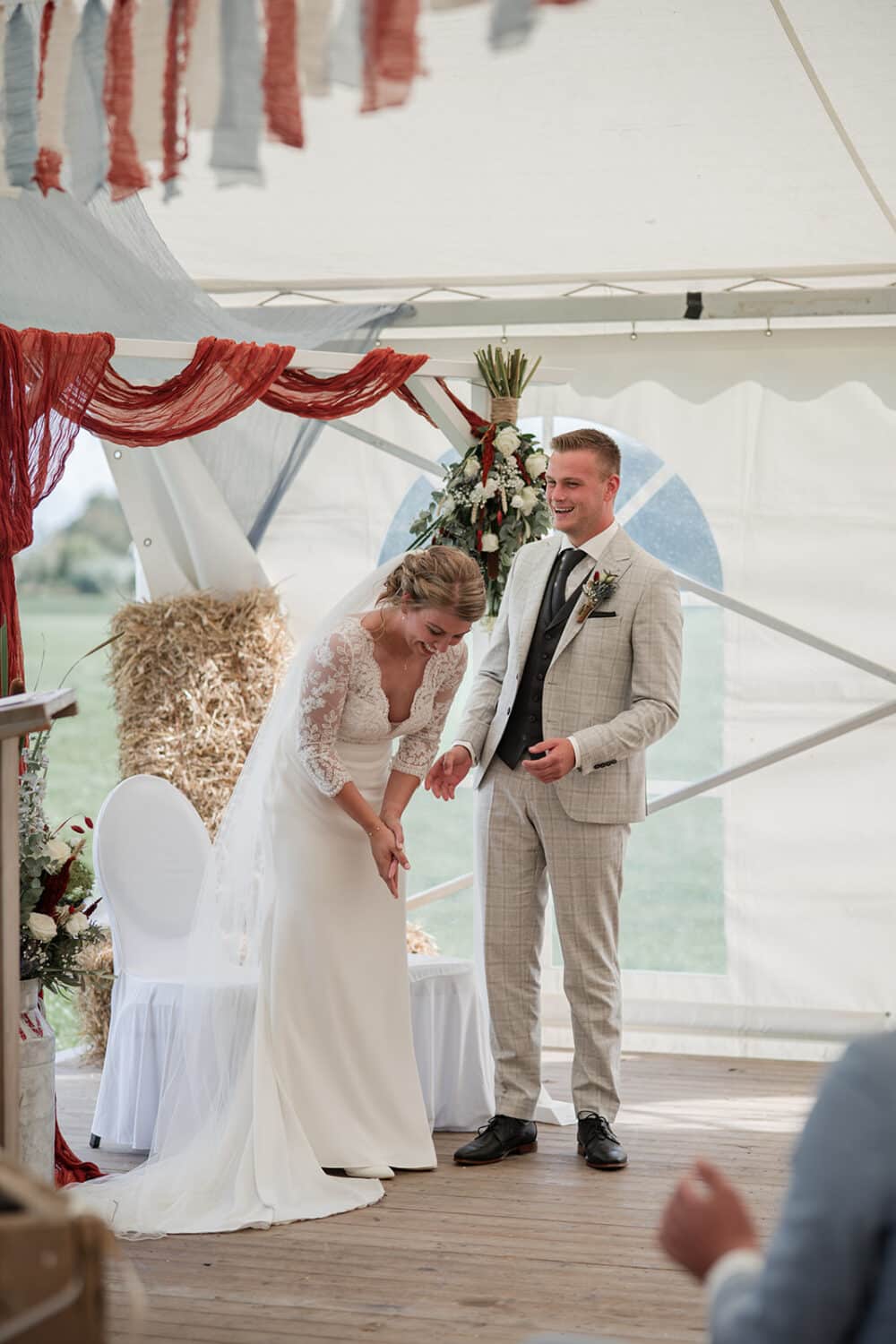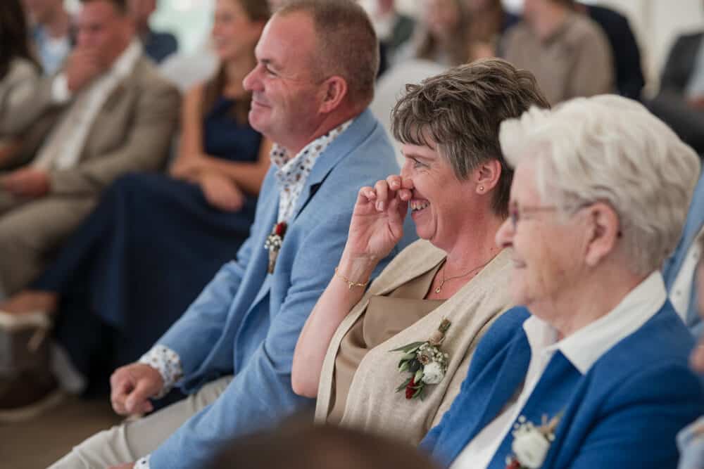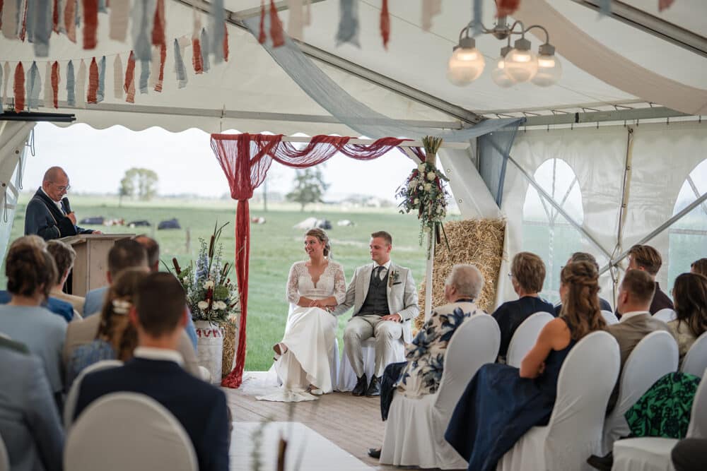 De ceremonie bevond zich in de tent, en door het mooie weer hadden ze de achterkant van de tent opengevouwen zodat je super mooi het land in kijkt naar de koeien. Dit soort kleine dingen maakt zo’n dag helemaal persoonlijk!