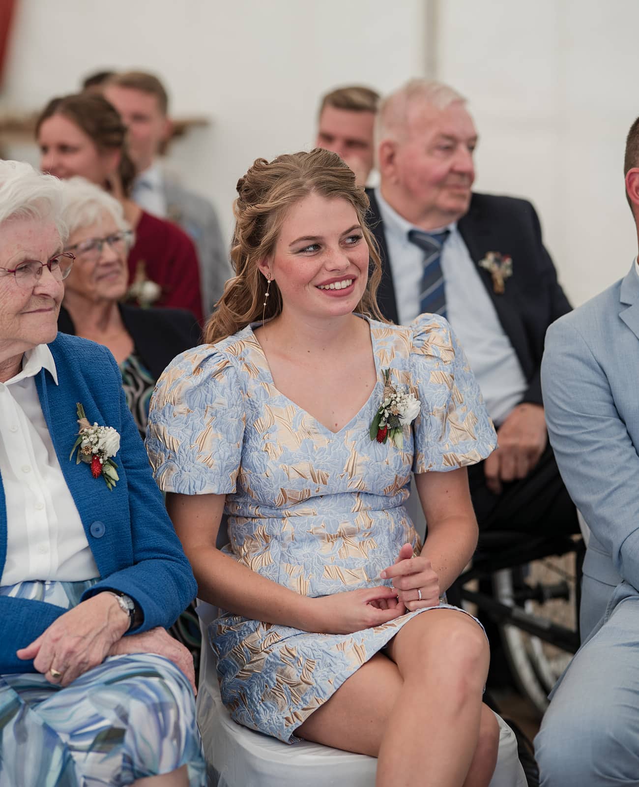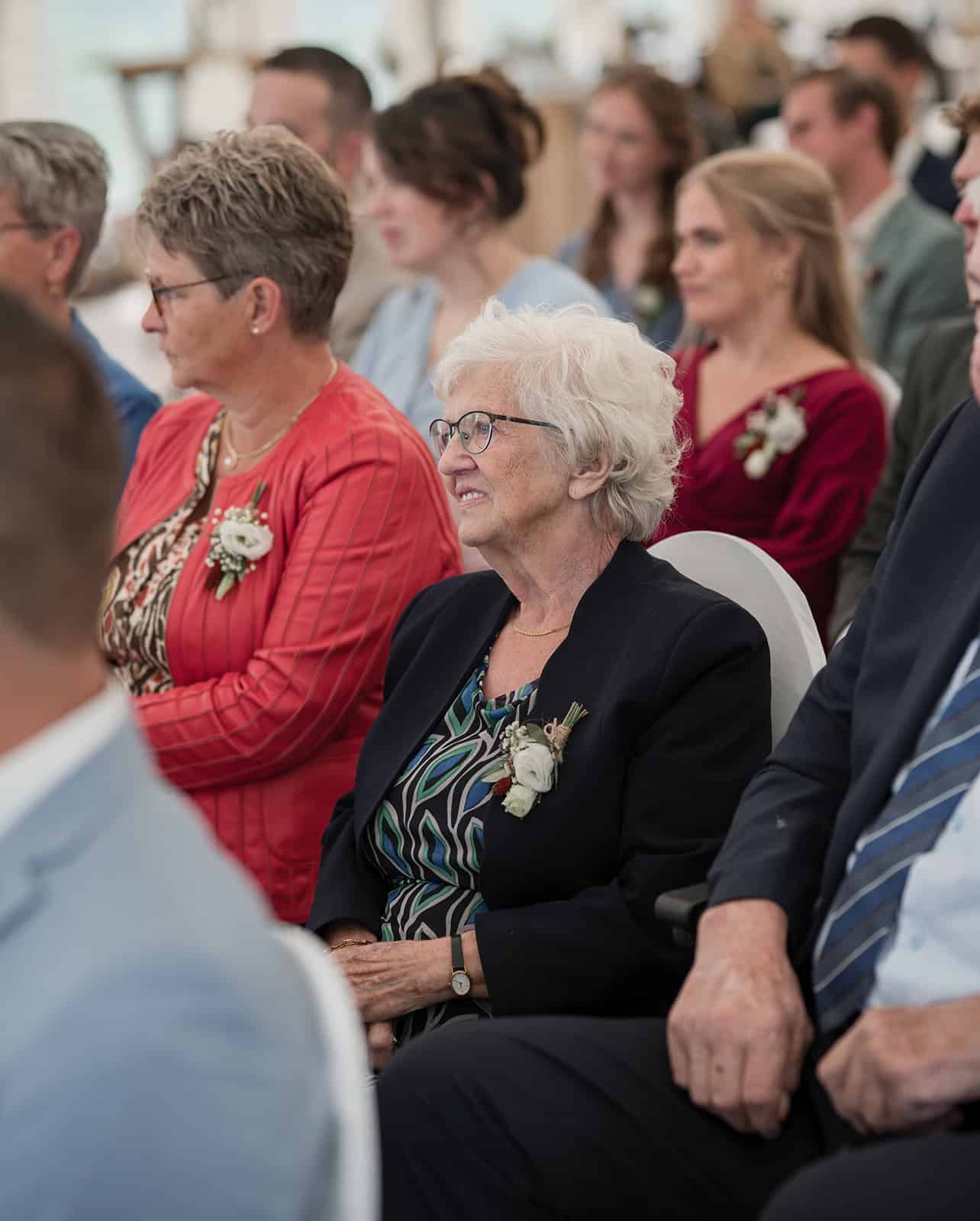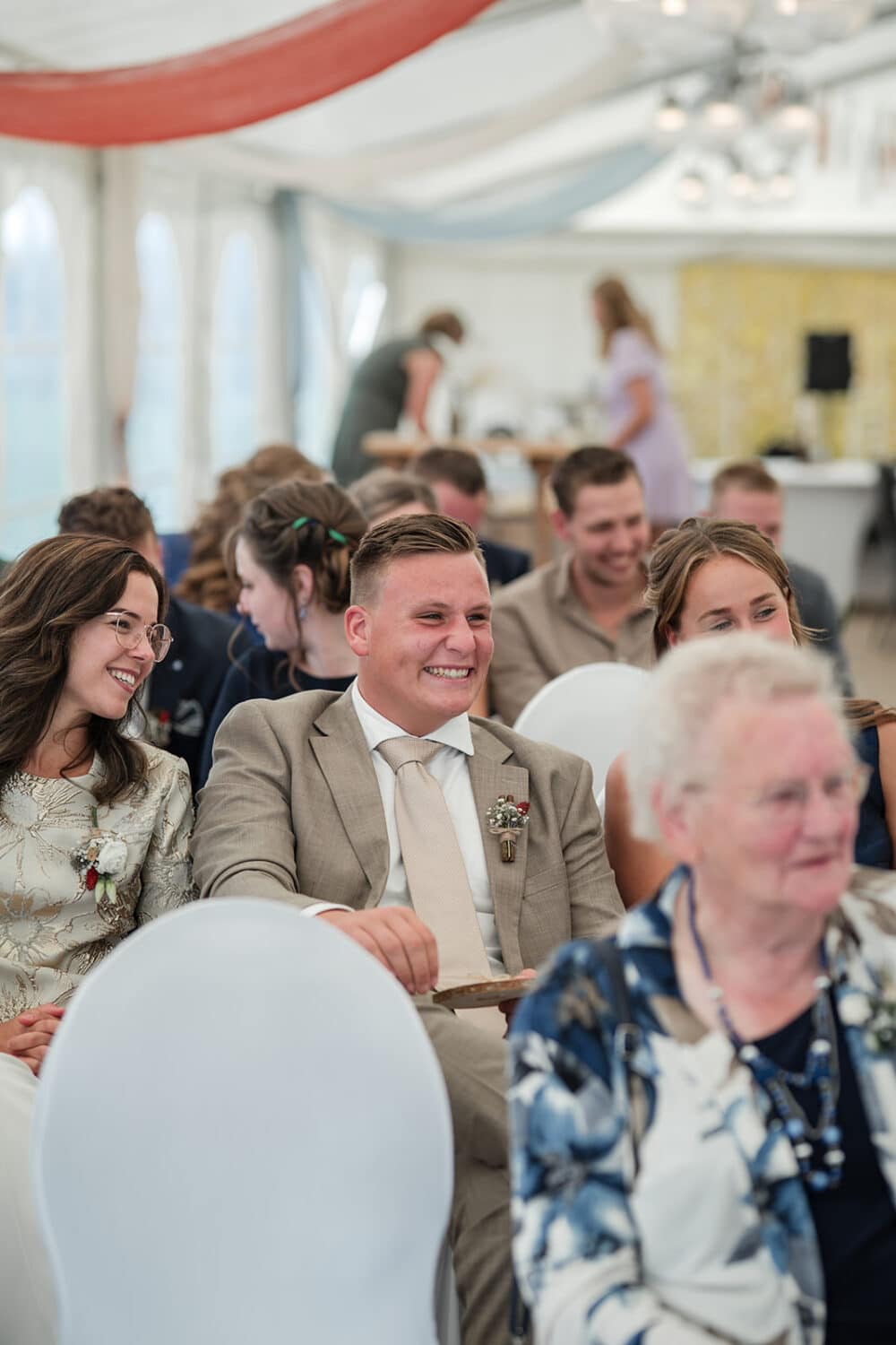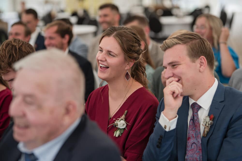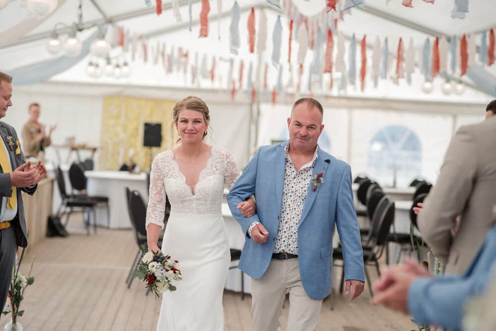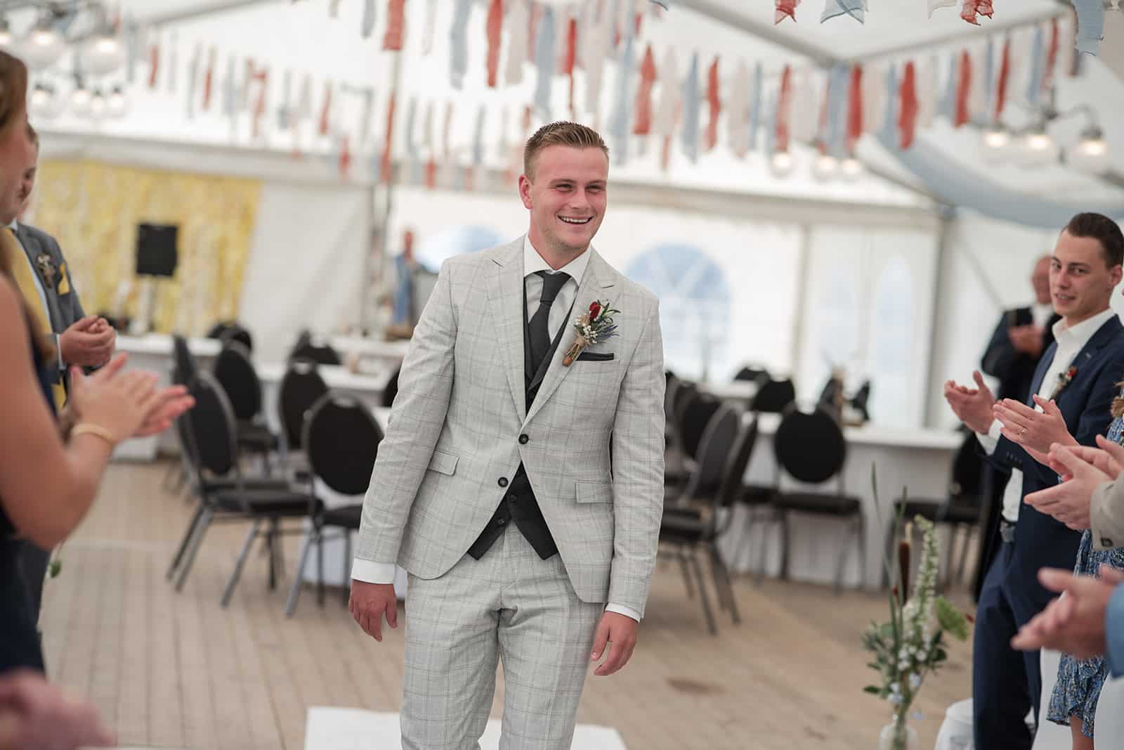 De ceremonie bevond zich in de tent, en door het mooie weer hadden ze de achterkant van de tent opengevouwen zodat je super mooi het land in kijkt naar de koeien. Dit soort kleine dingen maakt zo’n dag helemaal persoonlijk!